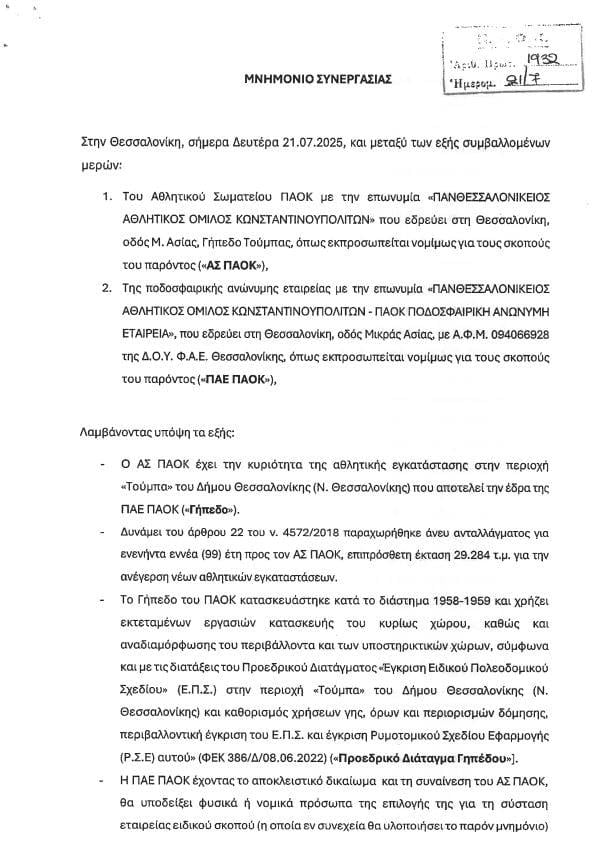Η ΠΑΕ ΠΑΟΚ έδωσε στη δημοσιότητα το Μνημόνιο Συνεργασίας που πρότεινε στον Ερασιτέχνη ως «οδικό χάρτη» για την κατασκευή της Νέας Τούμπας. Σε αυτό αποτυπώνονται τόσο τα δικαιώματα που παραχωρεί η ΠΑΕ στον Ερασιτέχνη, όσο και οι δεσμεύσεις που αναλαμβάνει για την πρόοδο του έργου.