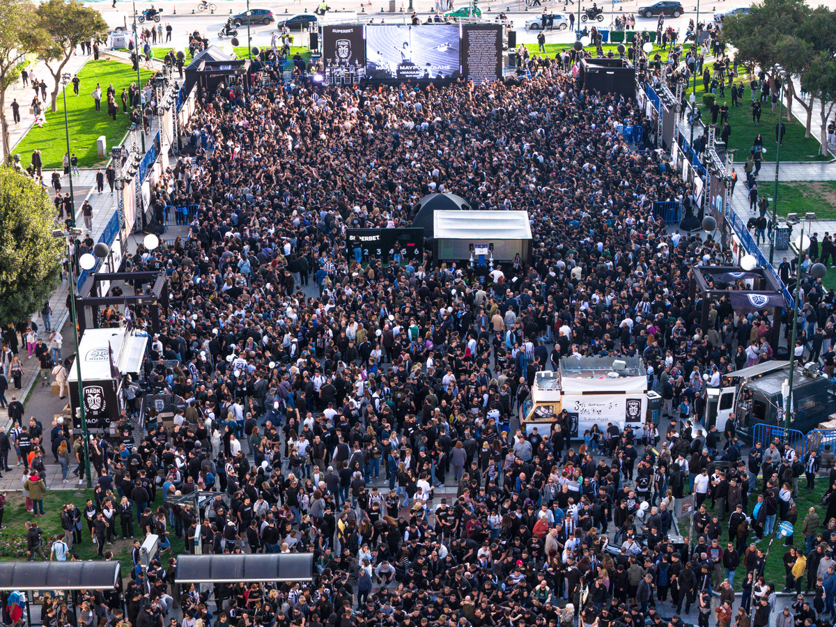 Φίλαθλοι του «Δικεφάλου», ο οποίος γεννήθηκε σαν σήμερα το 1926, πληθαίνουν στο κεντρικό τοπόσημο της πόλης όπου έχουν στηθεί γιγαντοοθόνες από τις οποίες προβάλλεται η ιστορία του συλλόγου.