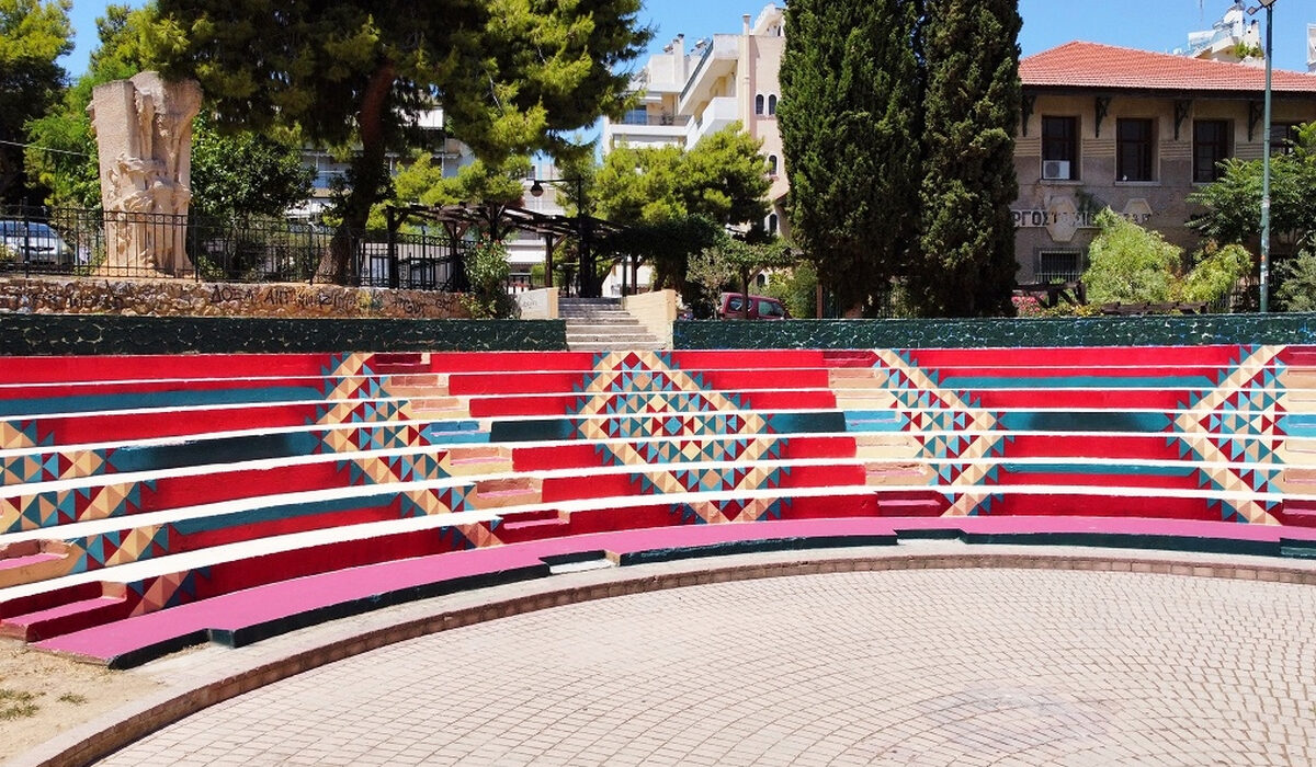 Η δημιουργία του street artist Achilles δανείζεται γεωμετρικά μοτίβα και χρώματα από τα παραδοσιακά χαλιά και κιλίμια που παρήγαγε κάποτε το ιστορικό προσφυγικό εργοστάσιο ταπητουργίας, το οποίο, ως διατηρητέο κτίριο, εξακολουθεί να στέκεται επιβλητικό πάνω από την κεντρική πλατεία.