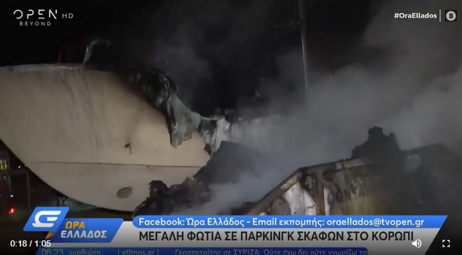 Μεγάλη φωτιά ξέσπασε τη νύχτα σε χώρο στάθμευσης σκαφών επί της οδού Άνδρου στο Κορωπί.