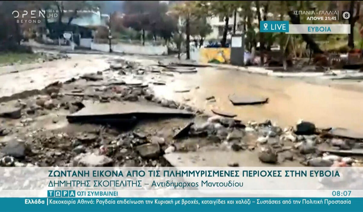 «Μετά την καταστροφική φωτιά, ήρθε η καταστροφική πλημμύρα. Δεν έχει μείνει τίποτα όρθιο, παραλία Αγίας Άννας, παραλία Αχλαδίου, έχουν καταστραφεί. Τα ποτάμια μπήκαν μέσα στα σπίτια. Η παραλία Αχλαδίου έχει μετατραπεί σε απέραντο ποτάμι. Έχουν κοπεί οι συνδέσεις σε όλα τα χωριά. Η κατάσταση είναι δραματική. Μέσα στο χωριό έχει φύγει ένα βουνό ολόκληρο. Έχουμε εκατοντάδες κλήσεις για άντληση υδάτων από σπίτια», είπε ο δήμαρχος Μαντουδίου και συνέχισε: «Προσπαθούμε να δούμε εάν οι άνθρωποι είναι καλά. Είναι τρομερή η κατάσταση, δεν την έχουν ξαναδεί τα μάτια μου τέτοια κατάσταση, ούτε με τη φωτιά είχαμε δει τέτοιο τραγικό γεγονός. Όλη η περιοχή έγινε ένα ποτάμι. Έριξε από τις 12 το βράδυ έως τις 2:30, δεν έχει μείνει τίποτα. Αγία Άννα, Αχλάδι και Κοτσικιά, έχουν προβλήματα. Δεν έχει κανένας κοιμηθεί. Με μηχανήματα έργου βγάζουμε τον κόσμο από τα σπίτια τους».