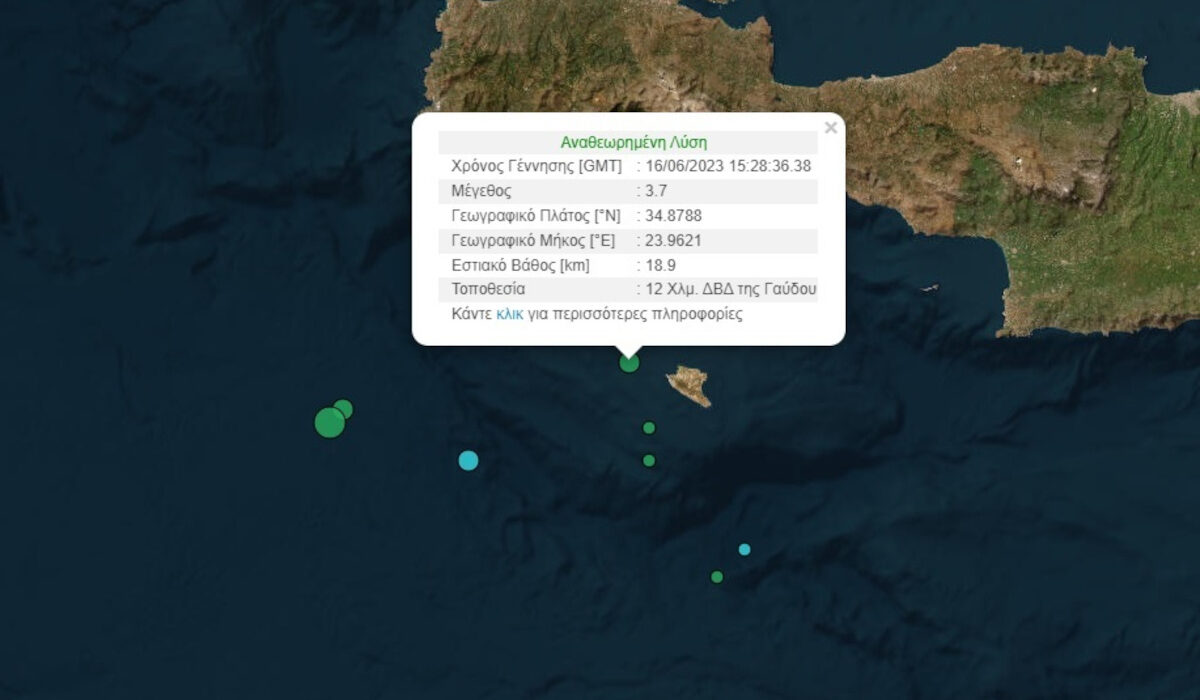 Η σεισμική δόνηση σημειώθηκε 12 xλμ. δυτικά-βορειοδυτικά της Γαύδου, με το εστιακό βάθος να εντοπίζεται στα 18,9 χλμ, σύμφωνα με το Γεωδυναμικό Ινστιτούτο.