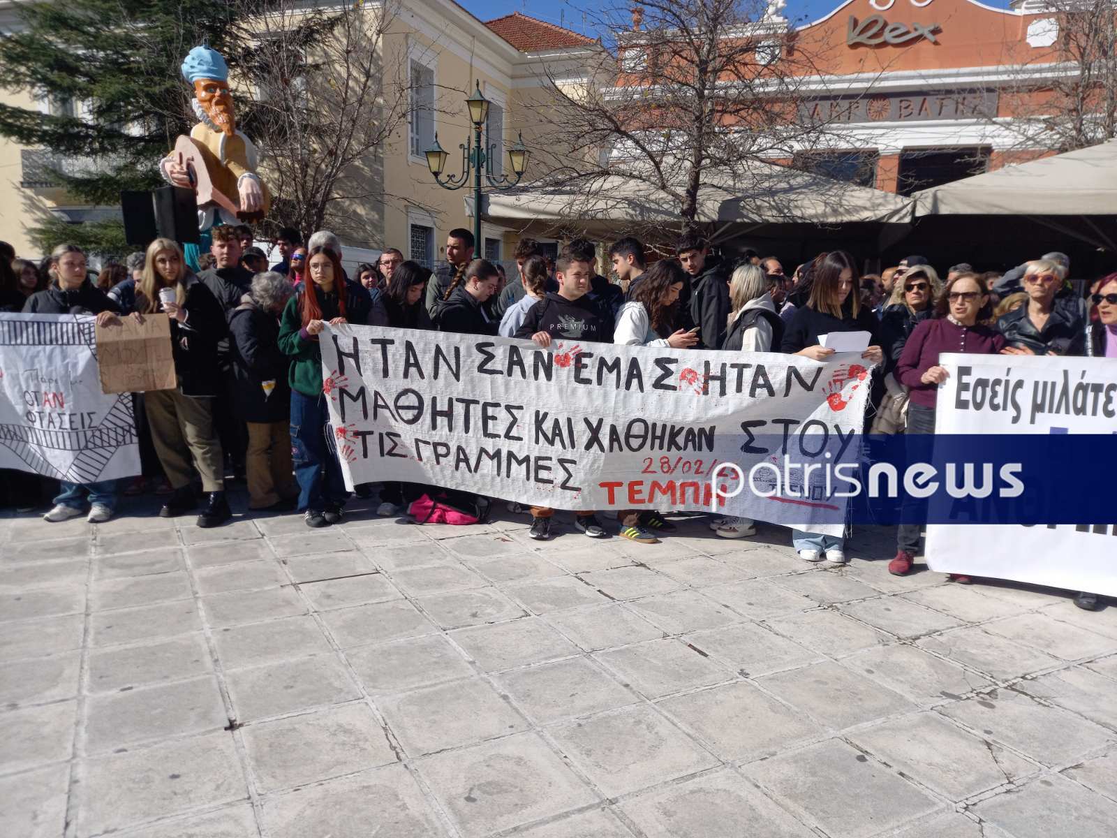 Φοιτητές, μαθητές, οικογένειες με παιδιά τιμούν τους νεκρούς του τραγικού δυστυχήματος των Τεμπών, σε μια πόλη που κατά τα άλλα θυμίζει νεκρή πόλη με τα πάντα να είναι κλειστά.