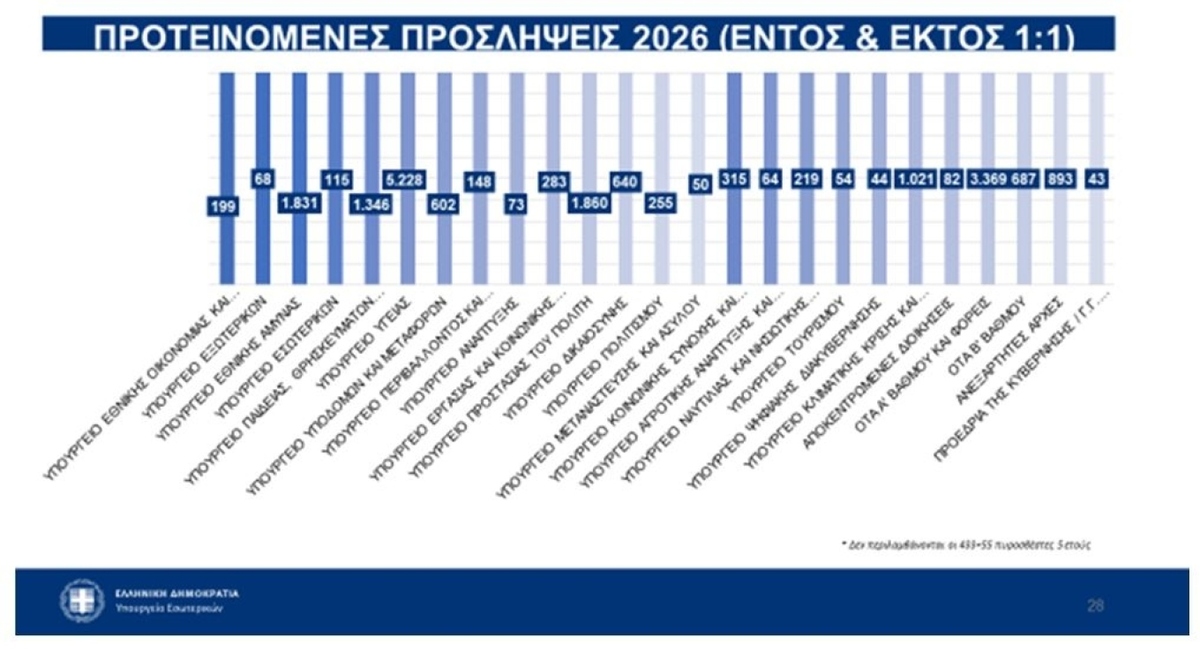 Αξίζει να σημειωθεί ότι ο προγραμματισμός των 19.489 προσλήψεων στο Δημόσιο για το 2026, αποτελεί συνέχεια των 122.203 προσλήψεων που έχουν εγκριθεί για τα έτη 2020 έως 2025 και άρα συνολικά 141.692 για το σύνολο της εξαετίας.
