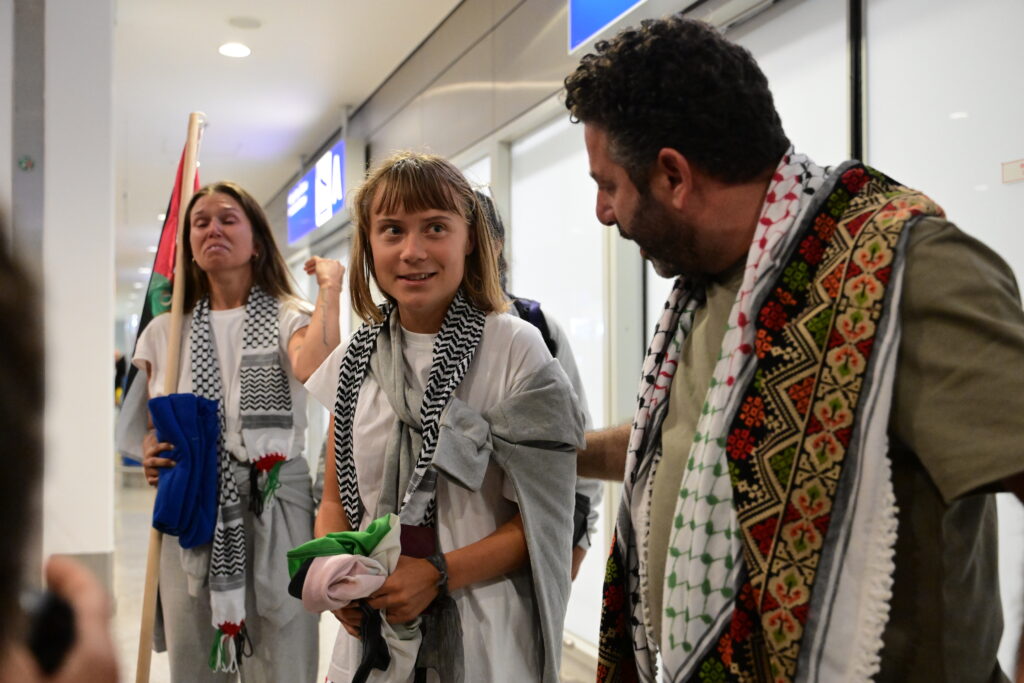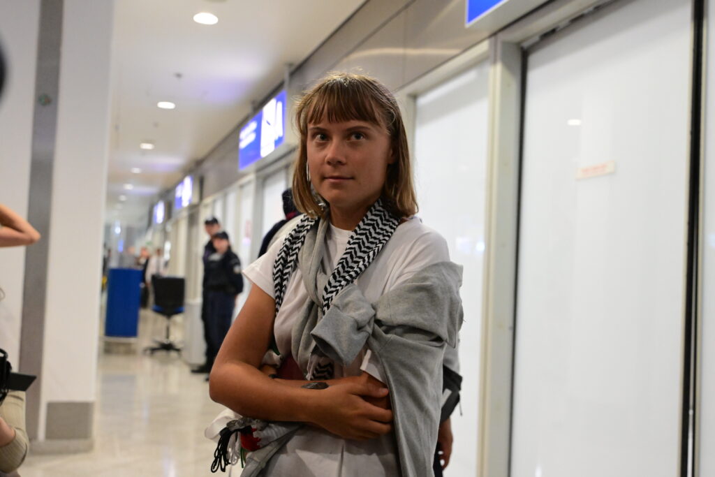«Άλλη μια φορά το διεθνές δίκαιο παραβιάστηκε [από το Ισραήλ], εμποδίζοντας την ανθρωπιστική βοήθεια να φτάσει στη Γάζα», δήλωσε η Σουηδέζα Γκρέτα Τούνμπεργκ κατά την άφιξή της στο αεροδρόμιο Ελευθέριος Βενιζέλος.