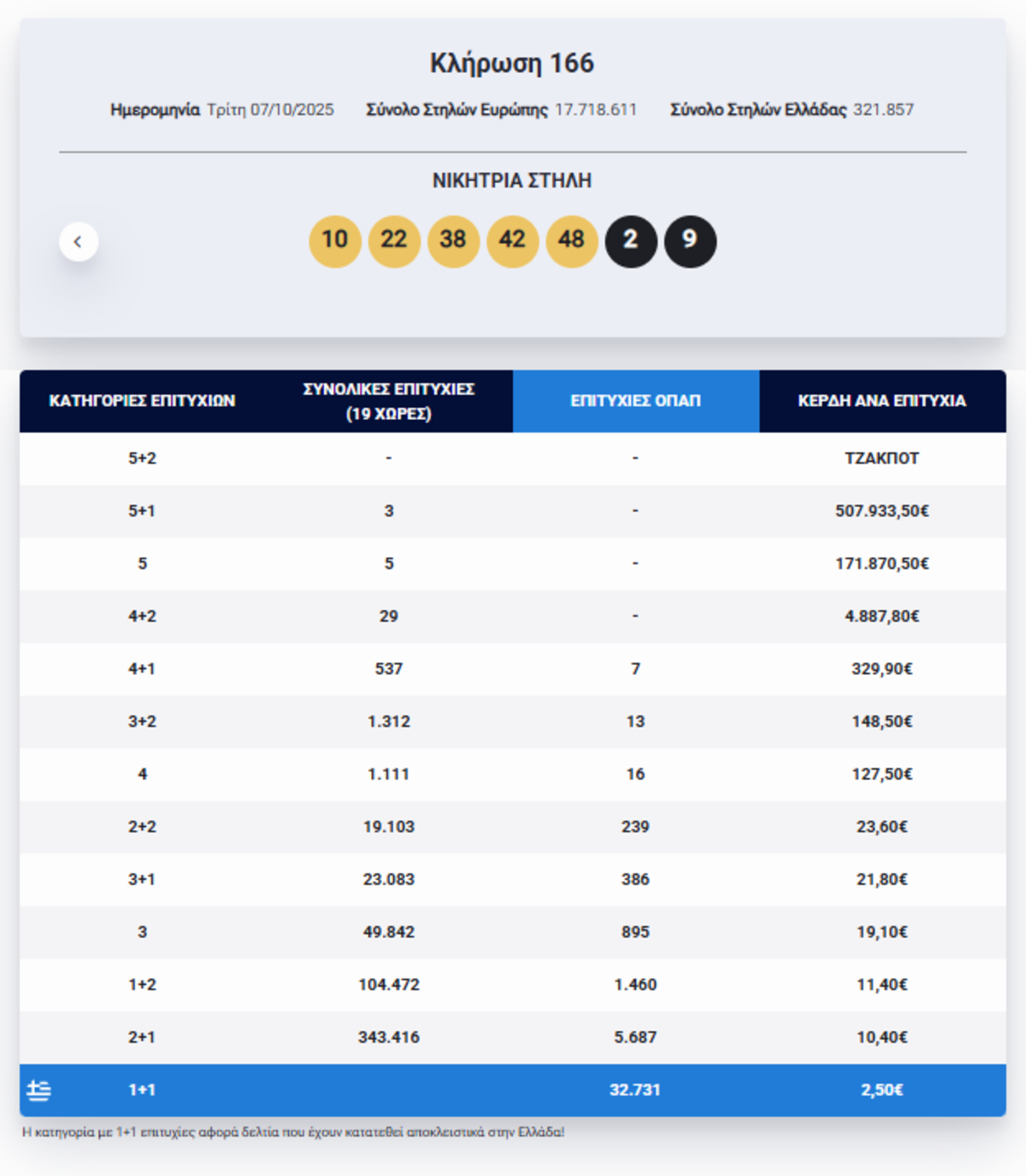 Eurojackpot Ελλάδα – Αποτελέσματα κλήρωσης 7/10/2025 και κέρδη ανά επιτυχία