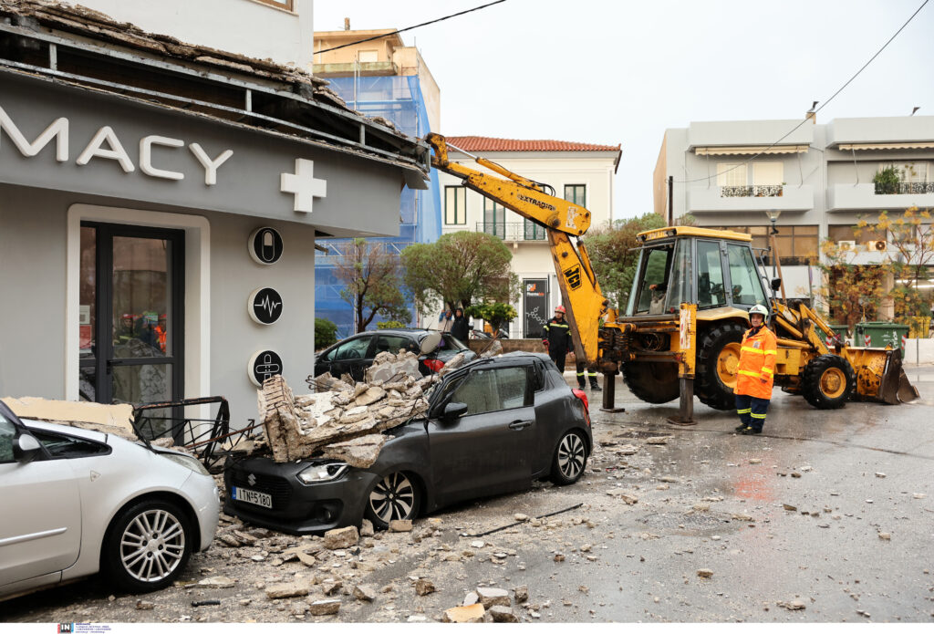 Στο ισόγειο του κτιρίου στεγάζεται ένα φαρμακείο κι ευτυχώς εκείνη τη στιγμή δεν περνούσε κάποιος πεζός από το σημείο.