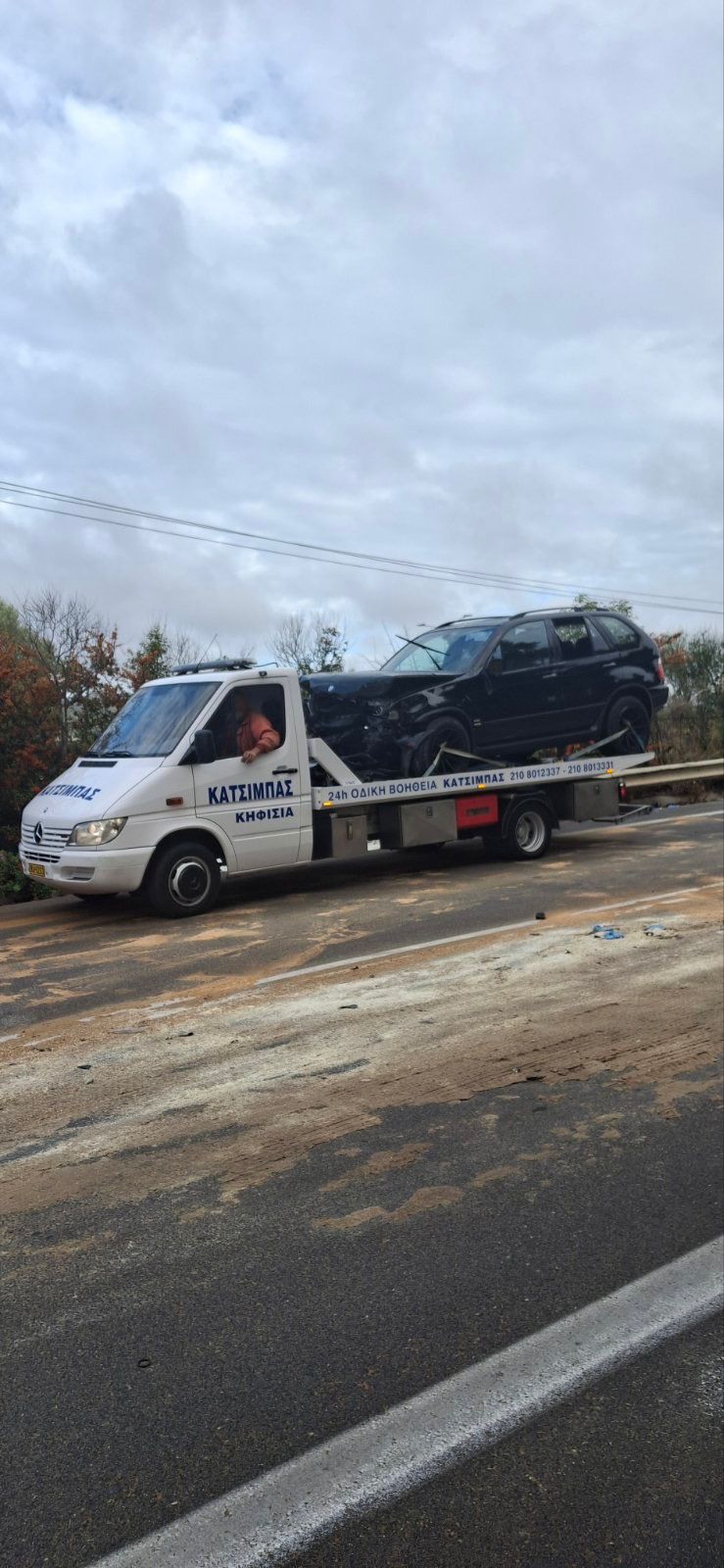 Το όχημα πέρασε στο αντίθετο ρεύμα κυκλοφορίας και συγκρούστηκε μετωπικά με δεύτερο, μαύρο Ι.Χ. στο οποίο επέβαινε ένα άτομο. Η σύγκρουση ήταν σφοδρότατη, με αποτέλεσμα δύο άνθρωποι (οι πρώτες πληροφορίες έκαναν λόγο για 3) να χάσουν τη ζωή τους και άλλοι τρεις να τραυματιστούν, δύο εκ των οποίων σοβαρά. Η σύγκρουση ήταν τόσο σφοδρή ώστε καθίσματα εκτινάχθηκαν σε ακτίνα ακόμα και 20 μέτρων.