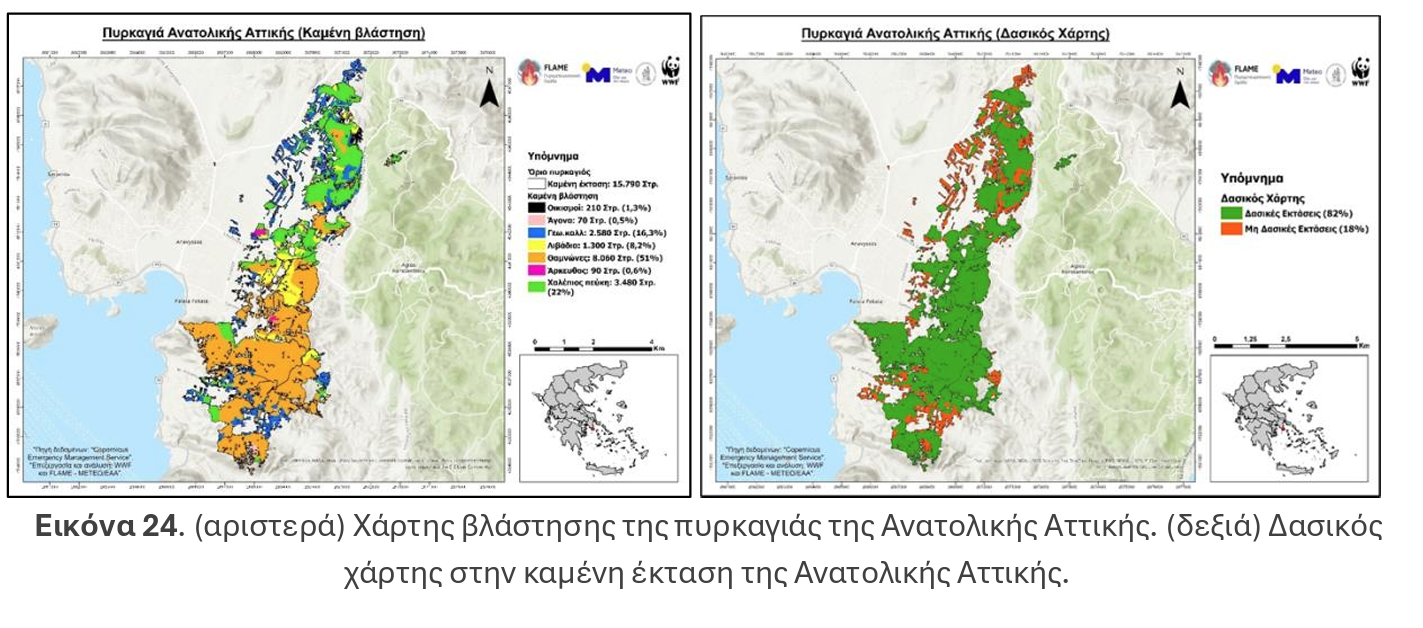 Η μεγαλύτερη οικολογική επίπτωση των πολλαπλά καμένων εκτάσεων, «εντοπίζεται στην περιοχή της Ανατολικής Αττικής, όπου η βλάστηση έχει υποβαθμιστεί από τουλάχιστον 3 σημαντικές πυρκαγιές τα τελευταία 20 έτη».