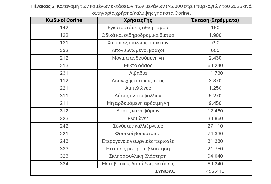 Συγκριτικά με την περίοδο 2006-2024, «η αντιπυρική περίοδος του 2025, κατατάσσεται ως η πέμπτη χειρότερη σε ότι αφορά τις καμένες εκτάσεις και τον αριθμό των πυρκαγιών».