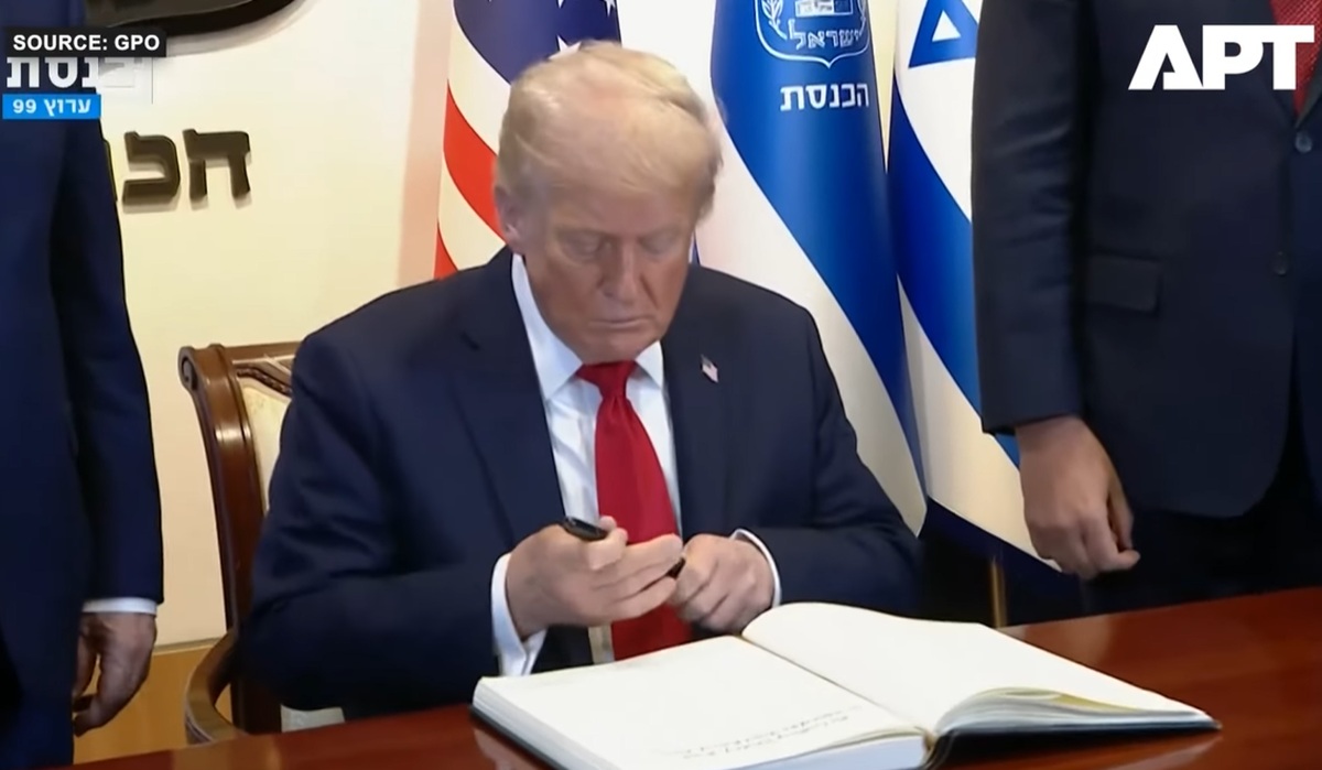 Ο Αμερικανός πρόεδρος, συνοδευόμενος από τον Πρωθυπουργό Μπενιαμίν Νετανιάχου και ανώτερους Ισραηλινούς αξιωματούχους, έγινε δεκτός από τον Πρόεδρο της Κνέσετ και υπέγραψε το βιβλίο επισκεπτών, γράφοντας με μαύρο μελάνι: