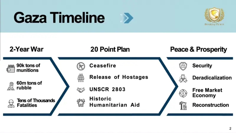 «Χρειαζόμαστε επενδύσεις» στη Γάζα, δήλωσε ο Κούσνερ, προβάλλοντας εικόνες με ψηλούς – φουτουριστικούς πύργους. «Το νούμερο ένα ζήτημα θα είναι η ασφάλεια. Προφανώς εργαζόμαστε πολύ στενά με τους Ισραηλινούς για να βρούμε έναν τρόπο αποκλιμάκωσης, και το επόμενο στάδιο είναι η συνεργασία με τη Χαμάς για την αποστρατιωτικοποίηση», είπε ο Κούσνερ.