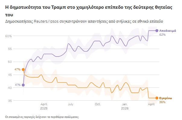 Ειδικότερα, η έρευνα, που διήρκεσε έξι ημέρες και ολοκληρώθηκε πρόσφατα, δείχνει ότι μόλις το 36% εγκρίνει την απόδοσή του στο προεδρικό αξίωμα, ποσοστό αμετάβλητο σε σχέση με τον προηγούμενο μήνα και το χαμηλότερο της θητείας του. Υπενθυμίζεται ότι το υψηλότερο επίπεδο αποδοχής του είχε φτάσει το 47%, λίγο μετά την ορκωμοσία του τον Ιανουάριο του 2025.