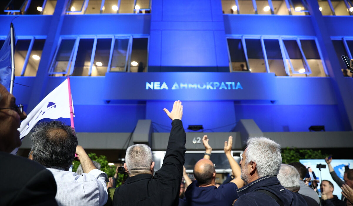 Πανηγυρικό είναι το κλίμα στην οδό Πειραιώς έξω από τα γραφεία της Νέας Δημοκρατίας μετά τα πρώτα αποτελέσματα των εκλογών 2023.