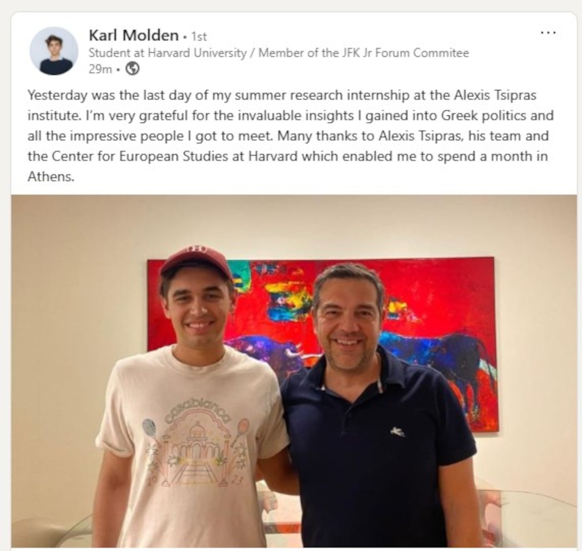Ο Καρλ Μόλντεν (Karl Molden) ένας από τους φοιτητές που είχαν την ευκαιρία να γνωρίσουν τον πρώην πρωθυπουργό την περίοδο που ήταν στο Harvard ανέβασε στον προσωπικό του λογαριασμό στο Linkedin post με αφορμή την ολοκλήρωση της πρακτικής του άσκησης στο Ινστιτούτο.