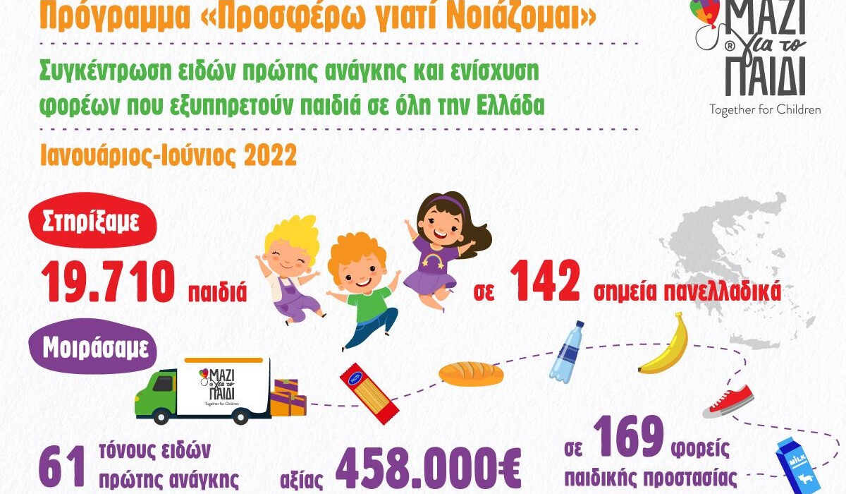 Το «Μαζί για το Παιδί», ανταποκρινόμενο σε αιτήματα βοήθειας που δέχτηκε, άφησε το κοινωνικό του αποτύπωμα σε 142 σημεία της Ελλάδας, προσφέροντας 61 τόνους ειδών πρώτης ανάγκης αξίας 458.000€ σε 169 φορείς παιδικής προστασίας.