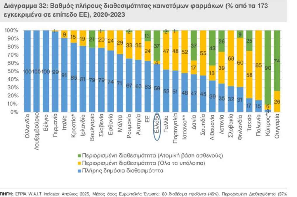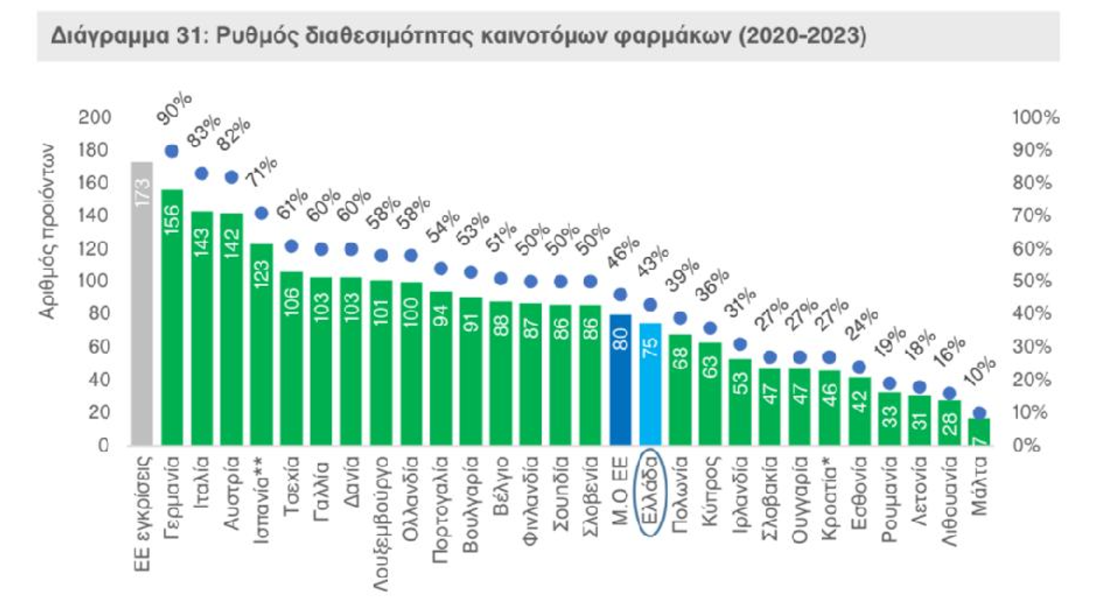Το περιβάλλον στην Ελλάδα όμως, δεν είναι ούτε προβλέψιμο ούτε φιλικό στην καινοτομία, με αποτέλεσμα οι ασθενείς, πολλές φορές, να λαμβάνουν μια νέα θεραπεία μήνες ή χρόνια αργότερα από τους ασθενείς άλλων χωρών της ΕΕ. Από τις νέες θεραπείες που εγκρίθηκαν ευρωπαϊκά την περίοδο 2020–2023, μόλις το 25% είναι πλήρως διαθέσιμες σήμερα στην Ελλάδα ενώ ένα ποσοστό γύρω στο 55% των νέων φαρμάκων δεν έχουν πάρει έγκριση ενώ 18% διατίθεται υπό περιορισμούς.